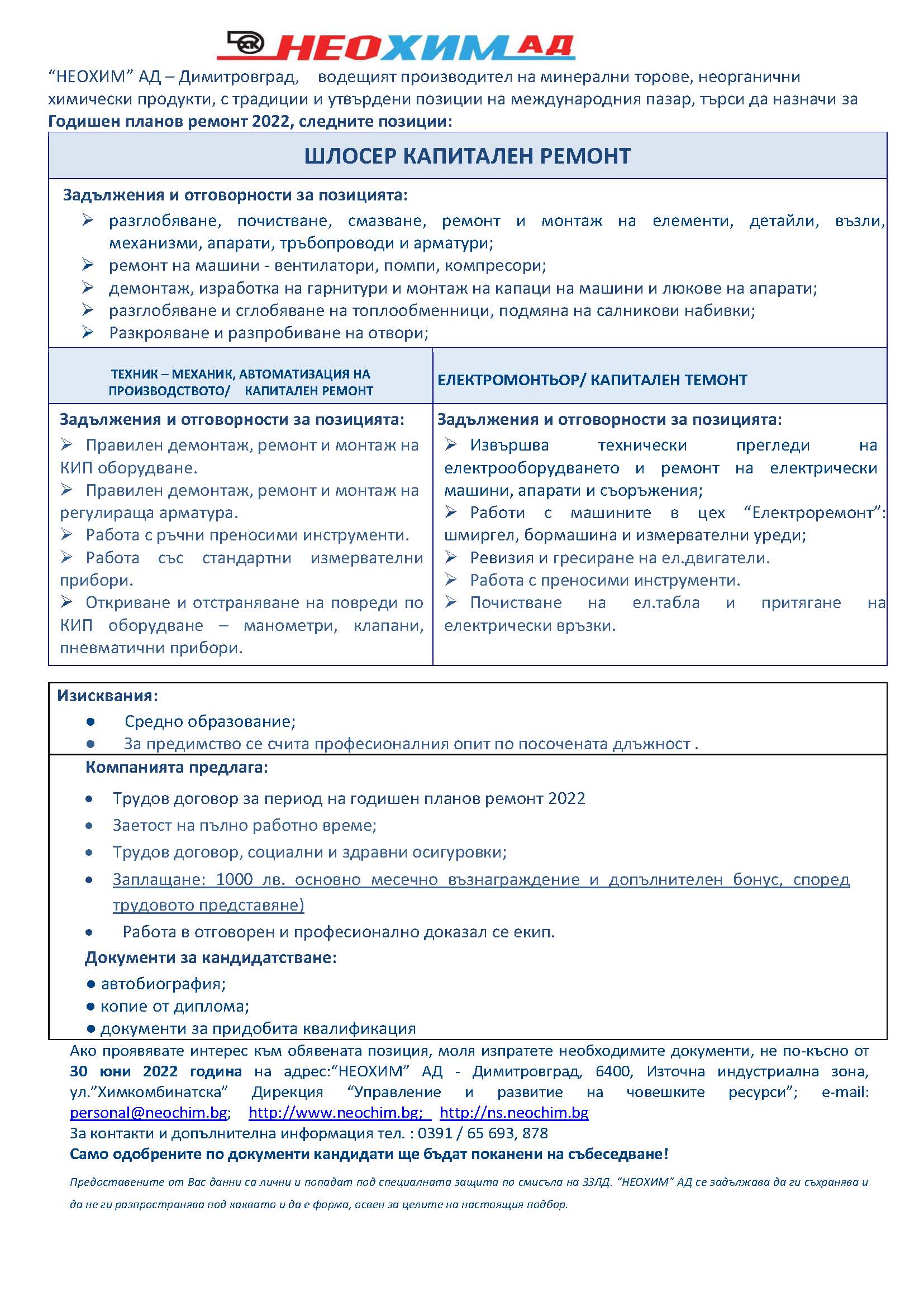 Неохим АД - Електротехници и техници автоматизирани системи за летен период, гр. Димитровград